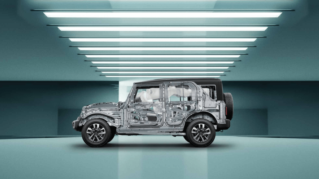 The Thar Roxx is built on the coming-of-age M_GLYDE platform chassis. Made of light weight high-strength steel, this is a structure lauded for its striking balance of stability, off-road prowess and superior ride quality. Attributes of the Roxx pertaining to its smooth and composed ride quality over uneven surfaces and sharp handling across varied terrains, are substantially amplified by an Independent Front Double Wishbone setup, which comes clubbed with Frequency Dependent Dampers and Watt’s Link Rear Suspension.
