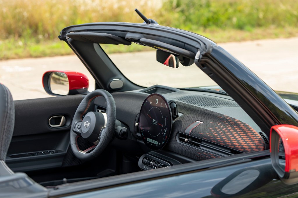 The dynamic interiors of the all-new MINI JCW and JCW Convertible exude supreme athleticism, featuring a vibrant red and black JCW colour scheme, and rigidly comfortable sports seats. Upscaling overall technical sophistication, these agile cockpits feature a distinct JCW steering wheel with textile accents, and a functional high-resolution OLED display.